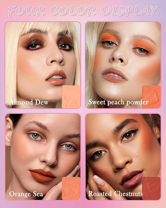 Matte Face Blush Palette Kit with Brush-4 Colors Pink Purple Orange Silky Mineral Blendable Blusher Contour Powder for Cheeks,Longlasting Professional Facial Beauty Makeup Gift for Women Girl-Set 02