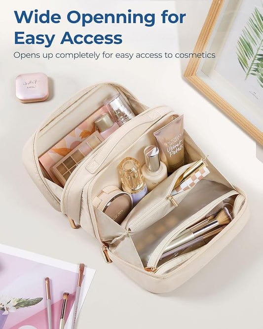 BAGSMART Travel Makeup Bag, Portable Make Up Bag, Wide-open Makeup Organizer Cosmetic Bags for Women for Travel Essentials Travel-Size Toiletries Accessories Bottles, Brushes (Beige)