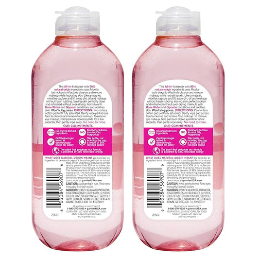Garnier Micellar Water with Rose Water and Glycerin, Hydrating Facial Cleanser & Makeup Remover, For All Skin Types, Vegan, Cruelty Free, 13.5 Fl Oz (400mL), 2 Count