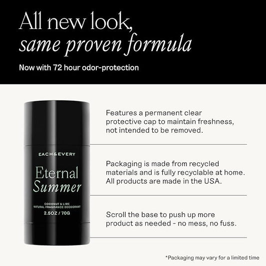 Each & Every Aluminum Free Deodorant for Men & Women, Coconut & Lime - All Natural Deodorant for Sensitive Skin, EWG Verified - Clean, Baking Soda-Free, Plant-Based Fragrance - 2.5oz, 2 Pack
