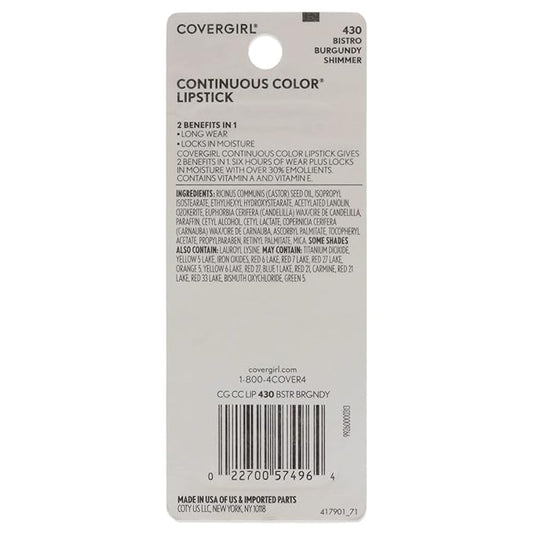 CoverGirl Continuous Color Lipstick - 430 Bistro Burgundy Lipstick Women 0.13 oz
