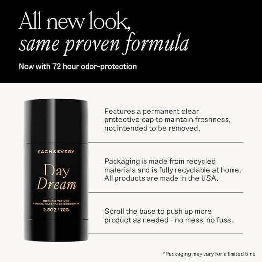 Each & Every Aluminum Free Deodorant for Women & Men, Citrus & Vetiver - All Natural Deodorant for Sensitive Skin, EWG Verified - Clean, Baking Soda-Free, Plant-Based Fragrance - 2.5oz, 2 Pack