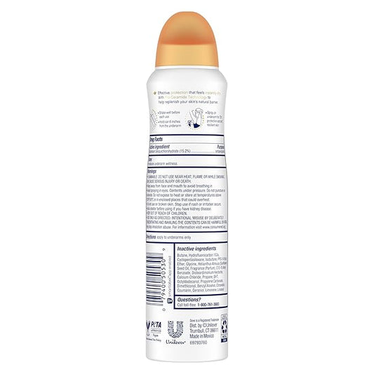Dove Advanced Care Antiperspirant Deodorant Dry Spray Peach & Chamomile Tea 3ct underarm care boosts skin's ceramide levels 72hour odor control &all-day sweat protection ProCeramide technology 3.8 oz