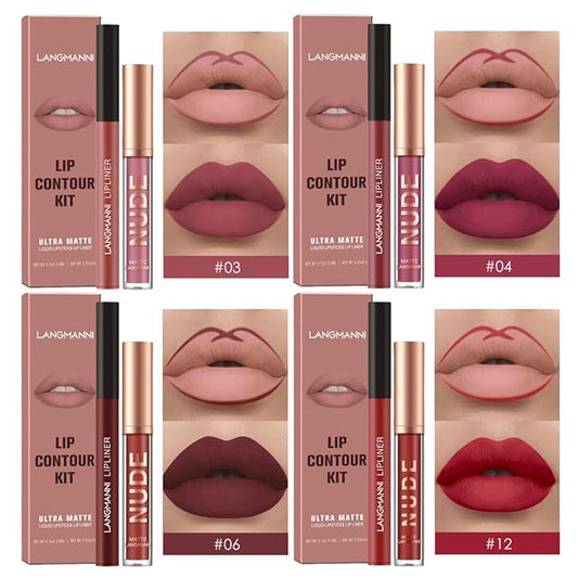 LANGMANNI 4pcs Matte Lipstick with Lipliners Durable Makeup Set,Long-Lasting Non-Stick Cup Not Fade Waterproof Pigmented Velvet Lipgloss Kit Beauty Cosmetics Makeup Gift for Girls(#3+4+6+12)