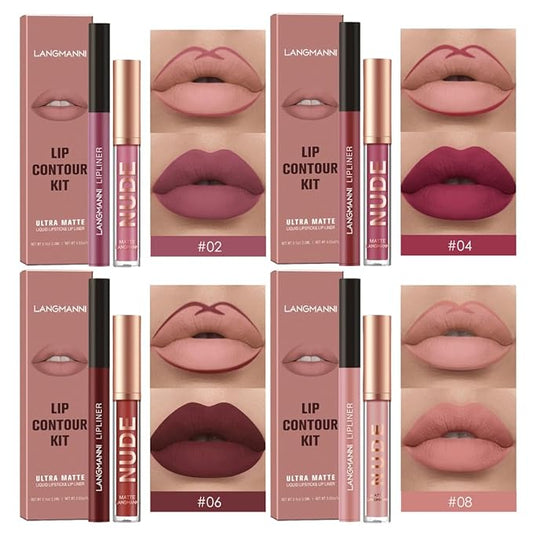 LANGMANNI 4pcs Matte Lipstick with Lipliners Durable Makeup Set,Long-Lasting Non-Stick Cup Not Fade Waterproof Pigmented Velvet Lipgloss Kit Beauty Cosmetics Makeup Gift for Girls(#2+4+6+8)