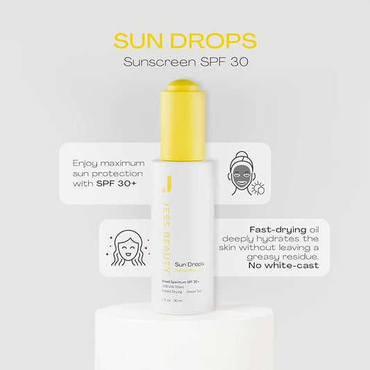 JESS BEAUTY | Face Sunscreen Sun Drops SPF 30 Skin Care Oil with Camellia Sinensis & Squalane | Skincare Fast Drying 1 fl. oz