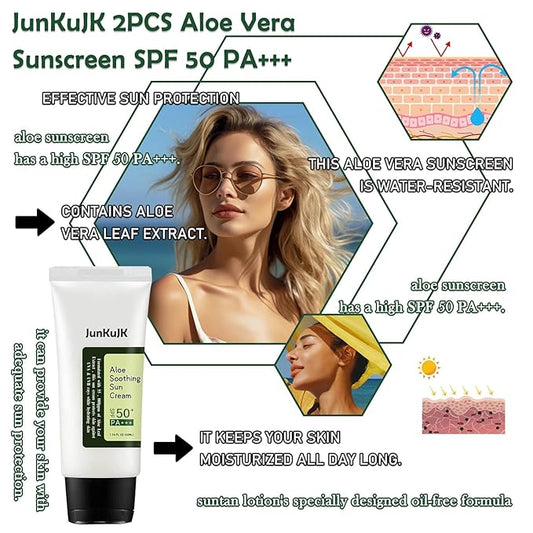 2PCS Aloe Vera Sunscreen SPF 50 PA+++,Moisturizing Long Lasting Non-Greasy Aloe Vera Sun Cream for Face & Body