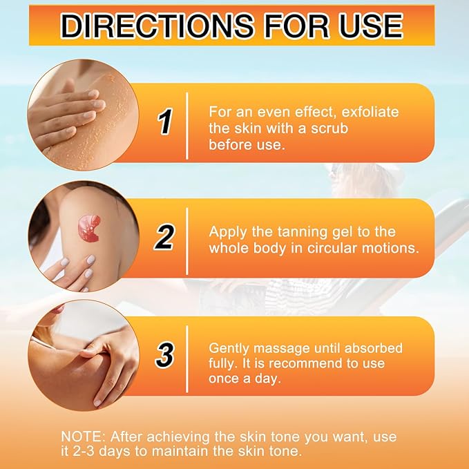 - 【Intensive Tanning Gel】Designed for use on sunbeds or during outdoor sun exposure, you can easily use it to give yourself a healthy, natural-looking tan. Enjoy a long-lasting, glowing, bronzed complexion.