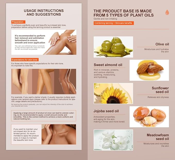 - 【3-in-1 Tanning Oil】 Specifically Designed for Those Who Want to Achieve A bronze Skin Tone Without Esposing Themselves to Harmful UV Rays.It Allows Them to Safely Achieve The Desired Deep Brown Skin Color Without Any Risk.