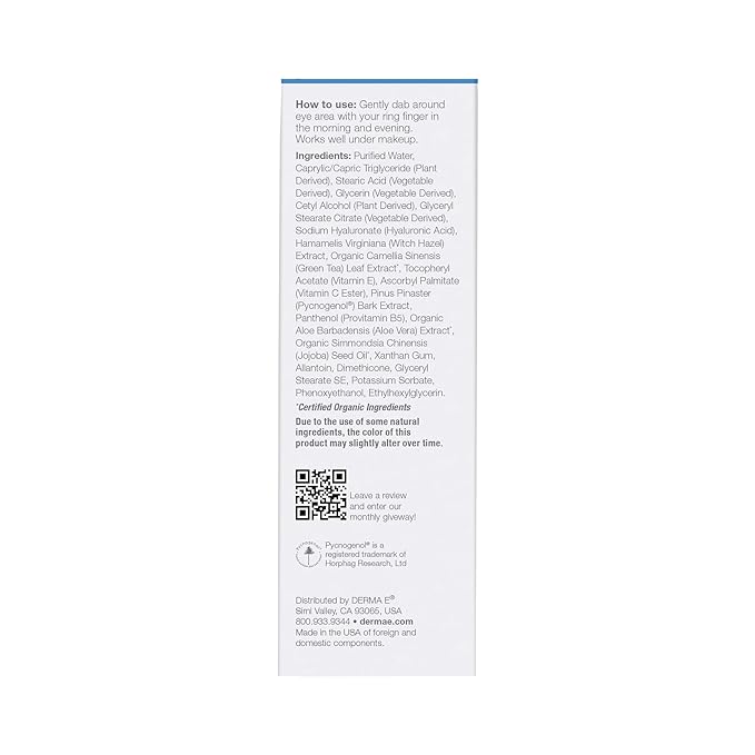 Derma E Hydrating Eye Cream – Firming and Lifting Hyaluronic Acid Treatment - Under Eye and Upper Eyelid Cream Reduces Puffiness and Appearance of Fine Lines, 0.5 oz