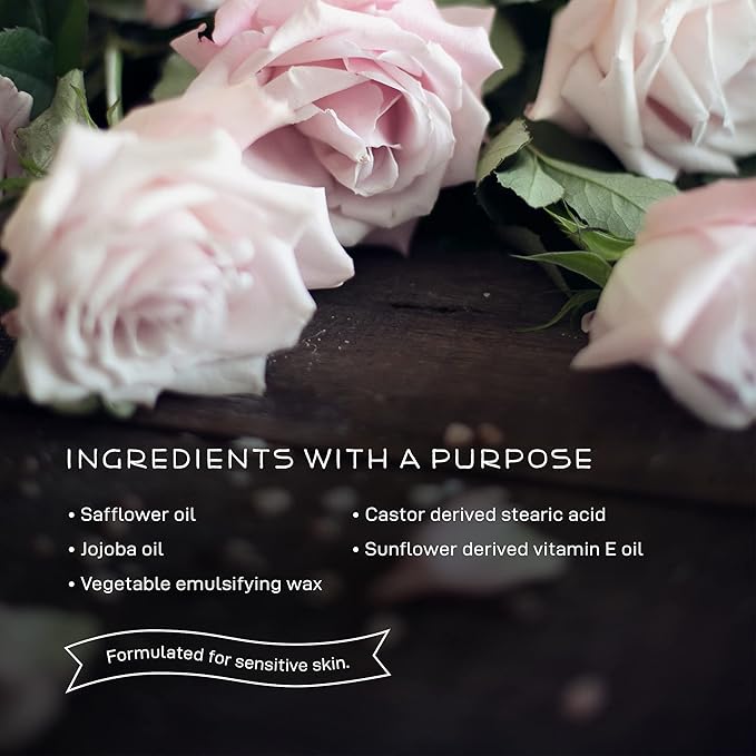 - KEY INGREDIENTS - Water, organic safflower seed oil, non-GMO emulsifying wax (vegetable), organic jojoba oil, non-GMO rose water, stearic acid (castor), organic propanediol (corn), organic pentylene glycol (sugar cane /corn cobs), organic phenethyl alcohol (corn), non-GMO vitamin E oil (sunflower)