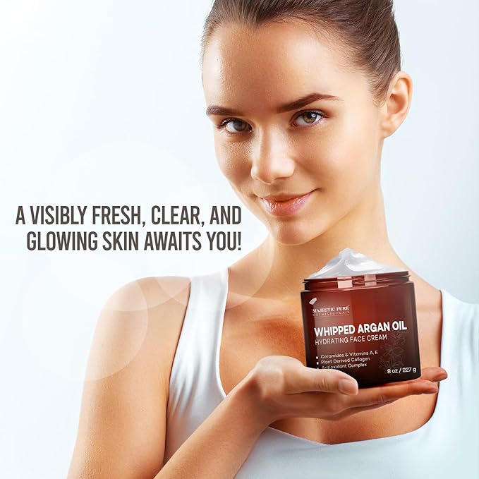 Majestic Pure Whipped Argan Oil Moisturizer Face Cream for Women & Men - With Vitamin E A, Collagen & Ceramides - Hydrates Dry Skin, Oily Skin, Reduces Appearance of Fine Lines – 8oz
