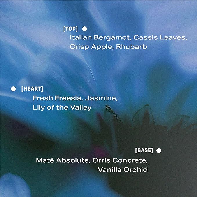 - SCENT NOTES: Top - Italian Bergamot, Cassis Leaves, Crisp Apple, Rhubarb. Heart - Fresh Freesia, Jasmine, Lily of the Valley. Base - Maté Absolute, Orris Concrete, Vanilla Orchid.