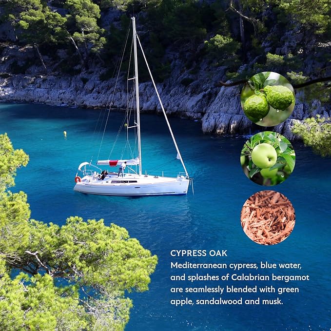 - PREMIUM FRAGRANCES ✓ Mediterranean cypress, blue water and splashes of Calabrian bergamot are seamlessly blended with green apple, sandalwood and musk creating a perfect balance of sophistication and freshness.