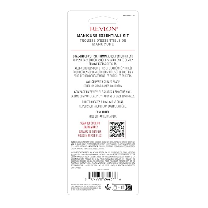 Revlon Manicure Essentials Kit with Travel Case, Nail Care Set with Dual Ended Cuticle Trimmer, Curved Blade Clippers, Compact Emeryl File & Buffer (Pack of 1)