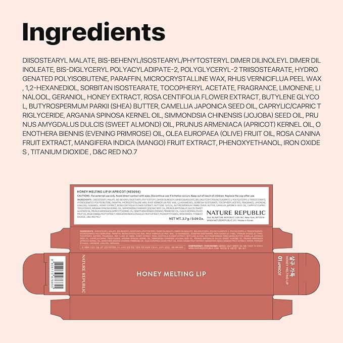 Nature Republic HONEY MELTING LIP (01 APRICOT) SOFT LIP STICK, Hydrating Gloss, Moisturizing balms, Sheer tint, Shine & Nude, Glowy Finish, korean make up