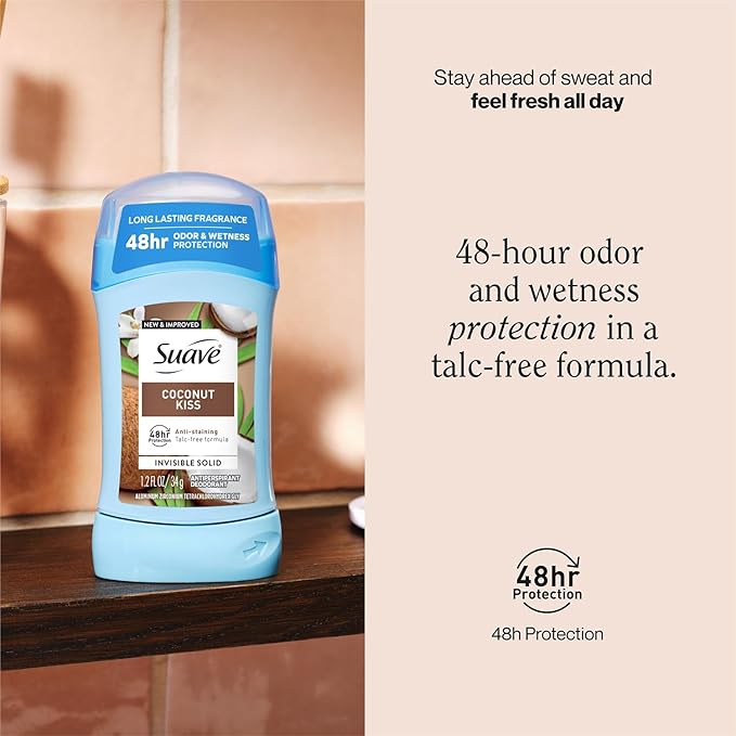 - SUAVE DEODORANT: Stay ahead of sweat and odor with a Suave Coconut Kiss women's deodorant stick.