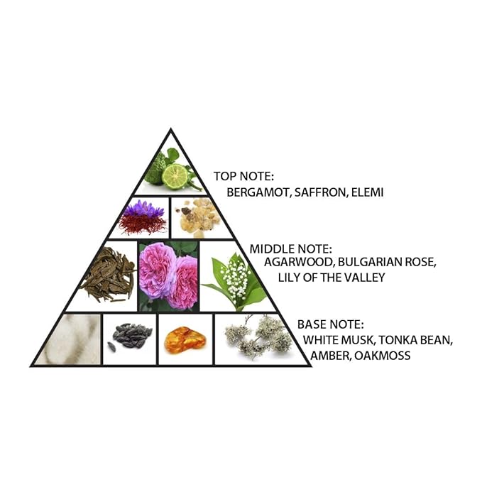 - Heart Notes - Agarwood, Bulgarian Rose, Lily of the Valley ; Base Notes - Tonka Bean, Amber, White Musk, Oakmoss.