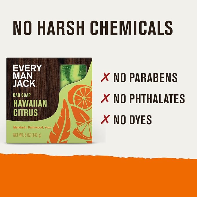 Every Man Jack Cold Processed Mens Bar Soap - Hawaiian Citrus Scent - Deeply Cleans & Hydrates w/Naturally Derived Ingredients - (3 Pack)