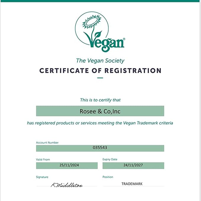 - Vegan & 100% Natural: Rosėe & Co believes animals belong in our arms, not in a lab. Our Cruelty- Free and Paraben - Free products are certified by the Vegan association.