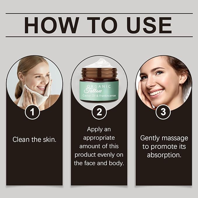 - Beef Tallow Castor Oil Frankincense: Our beef tallow frankincense oil castor oil deeply hydrates the skin, and tallow face moisturizer one application will continue to infuse the skin with the moisture it needs for a long period of time, beef tallow for skin can keep our skin hydrated and radiant all the time.