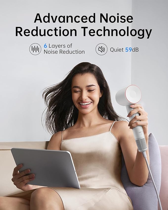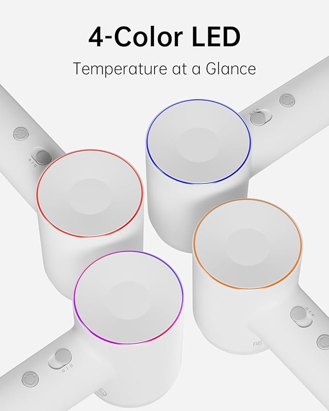 - [4-Color LED Ring Light & Low Noise] The three colors displayed on the circular LED ring correspond to temperature settings of hair dryer. Red indicates 80 degrees (hot air), yellow is 50 degrees (warm air), blue is cold air. Press and hold for two seconds to activate circulating mode shifting hot and cold air every few seconds. Despite the powerful motor and wind speed, the Laifen hair dryer operates at 59db while in use and is non-disruptive.