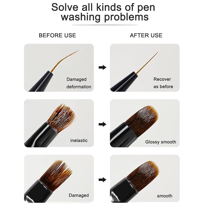 - How to use: Pour the appropriate brush cleaner into a glass, dip the brush bristles into the product for a moment, then swirl 3-5 times and rinse within a minute to restore the brush to its original suppleness.