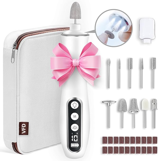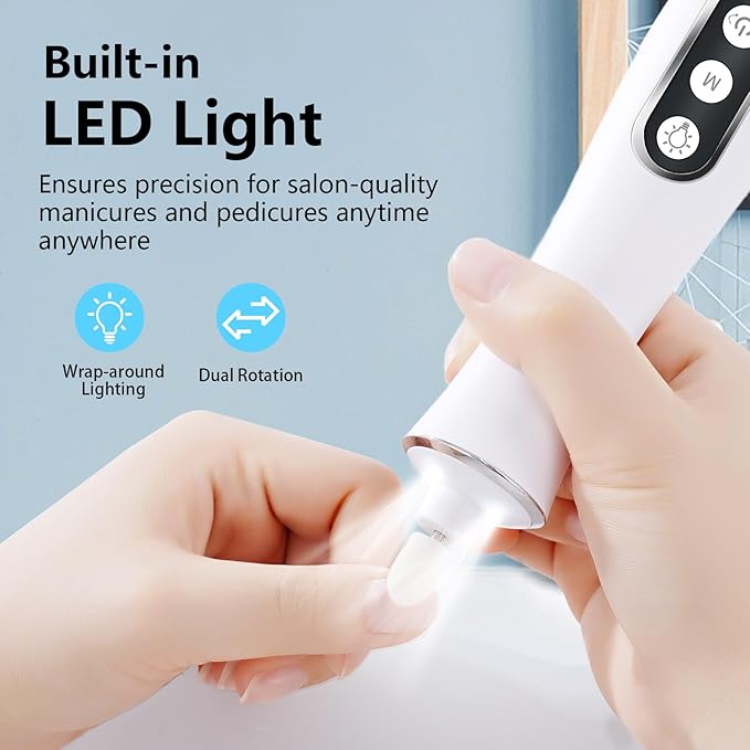 - 【Professional Hand & Foot Nail Care】With 11 accessories, including various grinding heads and LED light and lid tools, this drill nails kit meets all your nail care needs, from filing and shaping nails to removing calluses, and even works for gel nails. Enjoy salon-quality treatments at home!