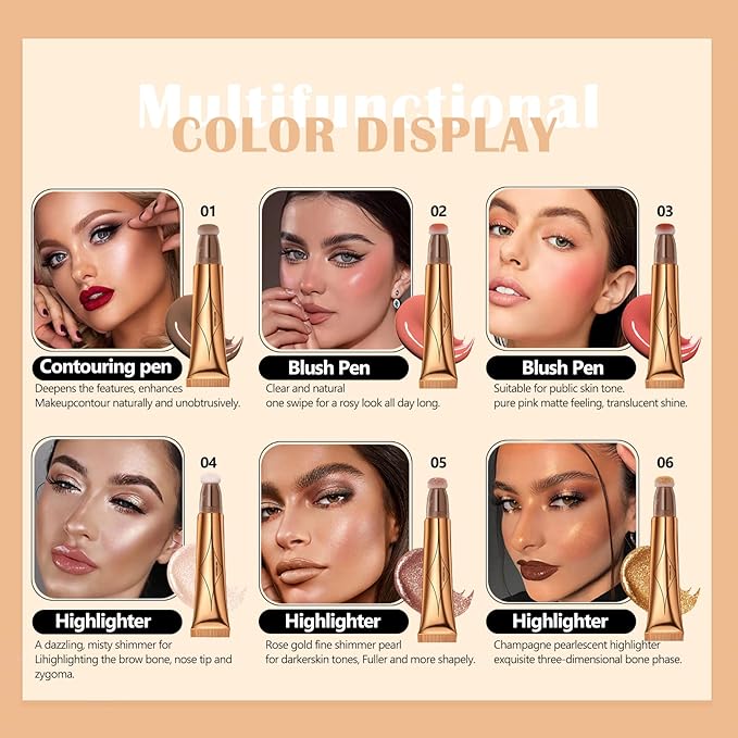- 【Multi-Functional Makeup Pen】The makeup pens feature a soft cushion applicator on the nozzle for applying and blending the liquid makeup. The Beauty Women Wands are available in 6 colors for different makeup effects. Color #01 is for contour; #02 are for cheek blush; #04 are for face body highlight. Perfect for daily makeup, meet your diverse needs.