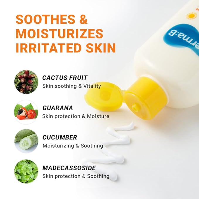 - THE WHOLE FAMILY’S SAFETY SHIELD FROM UV RAYS, FROM ADULTS TO CHILDREN: Contains cactus fruit, guarana, cucumber, and madecassoside that provide sufficient moisture and nutrition to the skin, soothe externally irritated skin and help the skin to retrieve its healthy condition. Mild soothing ingredients can be used safely by the whole family, from babies to adults, and comfortably relieve skin irritated by external factors and sun rays