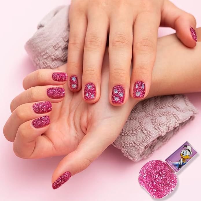 - KIT INCLUDES: Cosmetic shoulder bag. 3 well lip gloss compact with brush In pink, blue, and purple colors with cotton candy flavor for all. 2 glittery hair bows with puffy Mickey and Minnie icons. 2 peelable nail polishes in pink glitter and blue shimmer, that are both bubble gum scented. 1 pink, strawberry flavored lip balm. 1 round-shaped toe spacers. 1 sheet of gemstones. 1 nail file. All enclosed in satin shoulder bag.