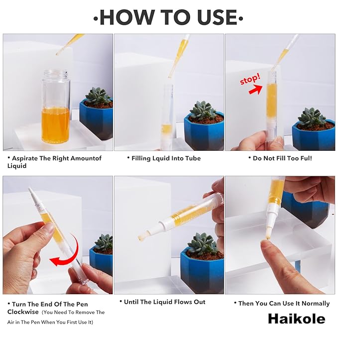 - Note:Please avoid overfilling the clear disposable cuticle oil pen to leave enough space for the brush tip. Do not twist it backwards as this may damage the internal gears