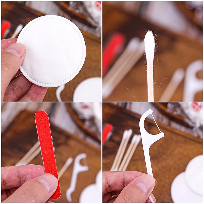 • SIZE: The hotel vanity pack has cotton pads that are 2.2 inches in diameter, cotton swabs that are 2.9 inches long, a nail file that is 2.8 inches long, and dental floss that is 3.1 inches long. Each size makes you more suitable for use.