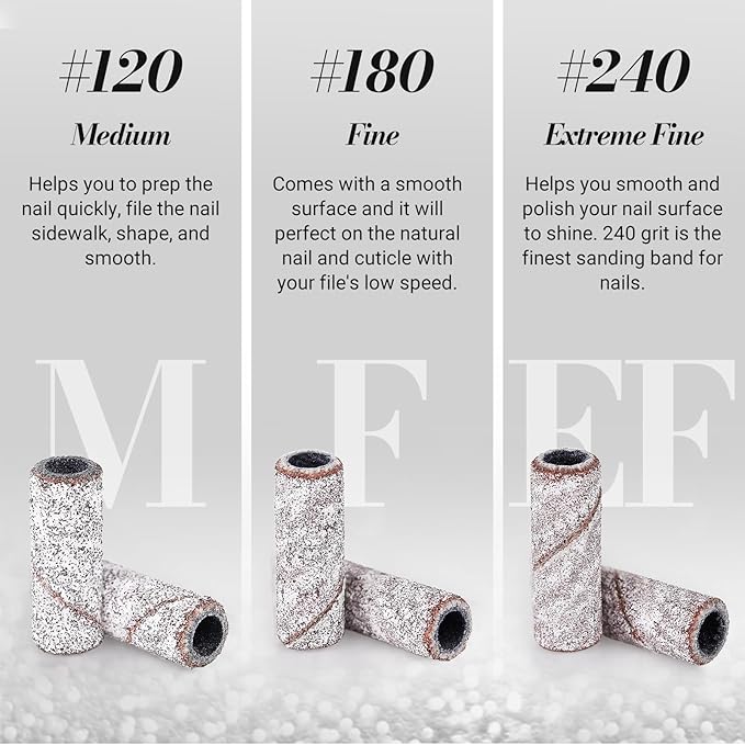 - Various Grit Options: 120# helps you to prep the nail quickly, file the nail sidewalk, shape, and smooth. 180# comes with a smooth surface and it will perfect on the natural nail and cuticle with your file's low speed. 240# helps you smooth and polish your nail surface to shine.