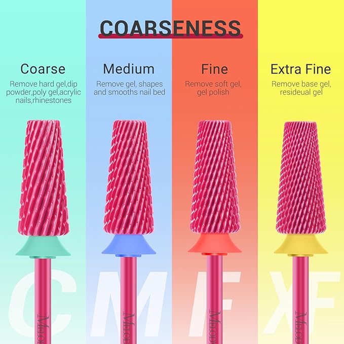 - Multifunctional: Include 5 different functions that can be used to clean the cuticle area, prepare the nail bed, shape and shorten the nail, smooth and remove on the surface, and clean under the nail. The Coarseness on the drill surface changes from top to bottom: Top is for cutting dead skin, 2nd part is Fine, 3rd part is Medium grit, and the bottom base is Coarse grit.