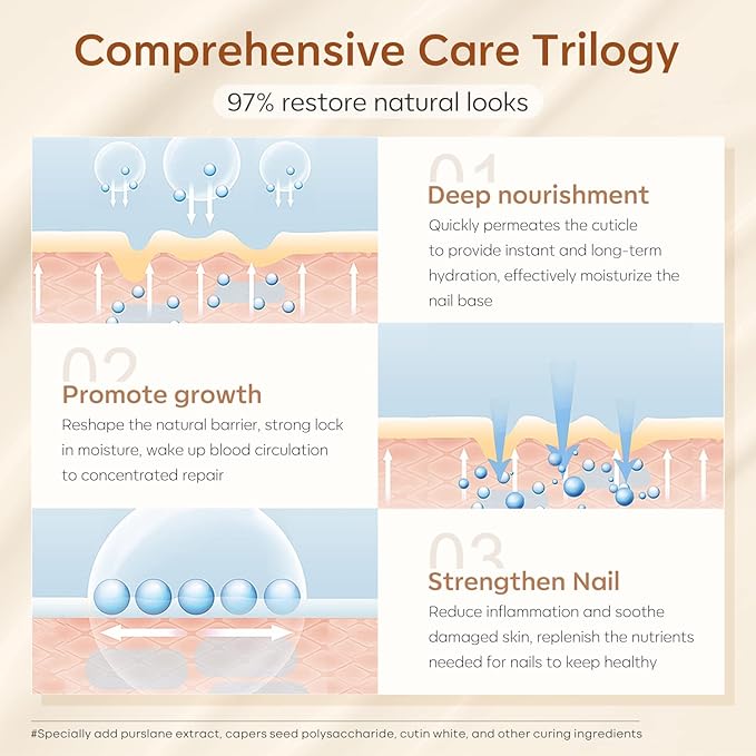 - 【Pure Organic Ingredients】The key ingredients are Glycerin, Jojoba oil, Macadamia Ternifolia seed oil and Vitamin E. These natural oils are excellent for moisturizing and relief cuticle to reduce dry cuticles, hangnails. Portulaca Oleracea Extract is specially added to this nail repair cream, which gives super power to cuticle growth, making nails and cuticles stronger. It is our must-have daily nail care products.