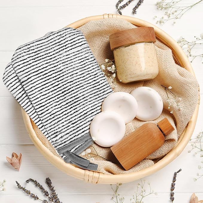 - Size:7.8"x5.1", perfect to wear on your hands or as a traditional face towel. Made of high-quality materials, face and body mitt set is very soft and delicate and does not irritate the skin, great for children and adults. Choosing striped towels can make your bathroom more stylish and modern, and the color and width of stripes are designed very beautifully.