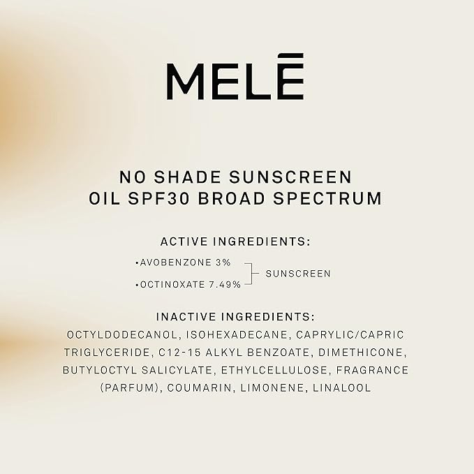 - Allure Best of Beauty 2022 Winner. LIGHTWEIGHT UV PROTECTION: MELÉ No Shade Sunscreen Oil provides SPF 30 Broad Spectrum protection that absorbs quickly so you can enjoy your day immediately
