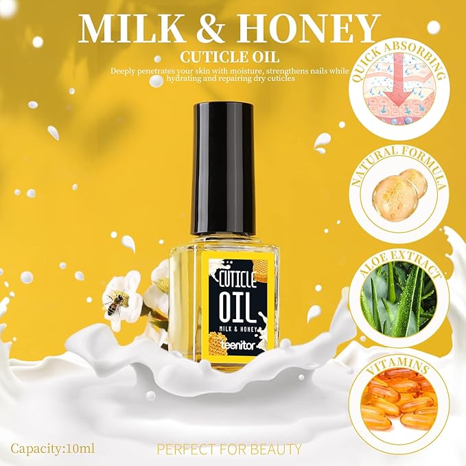 - Honey & milk Cuticle oil: natural honey and milk cuticle oil, rich in oils and multivitamins. Can quench dry cuticles, provide antioxidant protection and deeply soothes and hydrates skin. Cuticle oil protects and nourishes dry, brittle or cracked cuticles, nails and skin, leaving your cuticles and nails looking shiny and lustrous