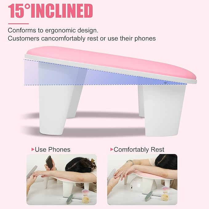 - ARM PILLOW SOFA: Our arm rest for nails tech is angled at 15° to provide ergonomic support for nail care; allowing guests to enjoy a better experience during the nail care process, made of delicate PU leather and soft elastic sponge,You can even rest on your stomach the hand pillow to rest. the U-shape design ensures that both the technician and the customer can get the maximum degree of comfort, making the nail care process more enjoyable and simpler.The U-shaped design ensures maximum comfort for both the technician and the customer, making the nail care process more enjoyable and easier.