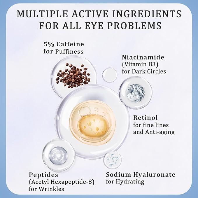 - Eye Cream with Powerful Ingredients: 5% caffeine, retinol, niacinamide, hyaluronic acid, and peptides to help with well-aging, reducing puffiness, or getting rid of dark circles. Reveal brighter, more youthful-looking eyes!